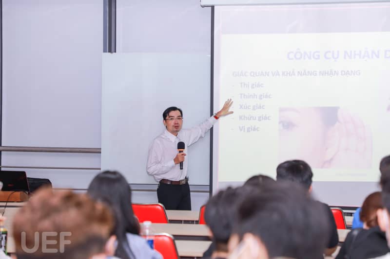 Cũng là diễn giả của học phần Xây dựng thương hiệu cá nhân, ThS. Nguyễn Phát Tài đã bổ sung kiến thức cho sinh viên về công cụ nhận dạng qua các giác quan gồm thị giác, thính giác, xúc giác, khứu giác và vị giác. Về mặt dùng hình ảnh và âm thanh để nhận dạng, các bạn sẽ cảm nhận được màu sắc ánh sáng, đường nét qua thị giác và cảm nhận dựa trên nội dung, hiệu ứng âm thanh, ghi nhớ khi nghe slogan thông qua thính giác.
