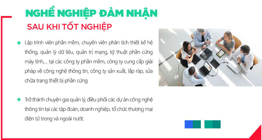 Lập trình viên phần mềm, chuyên viên phân tích thiết kế hệ thống, quản lý dữ liệu, quản trị mạng, kỹ thuật phần cứng máy tính,... tại các công ty phần mềm, công ty cung cấp giải pháp về công nghệ thông tin, công ty sản xuất, lắp ráp, sửa chữa trang thiết bị phần cứng