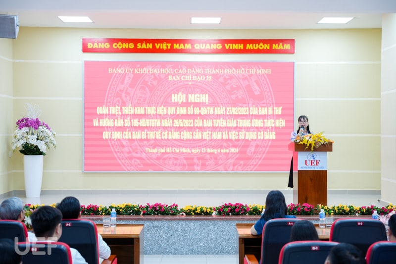 Sáng 23/4, tại UEF, Ban Tuyên giáo Đảng ủy Khối Đại học, Cao Đẳng TP.HCM đã tổ chức thành công Hội nghị quán triệt, triển khai thực hiện Quy định số 99-QĐ/TW ngày 27/02/2023 của Ban Bí thư và hướng dẫn số 105-HD/BTGTW ngày 29/5/2023 của Ban Tuyên giáo Trung ương thực hiện quy định của Ban Bí thư về cờ Đảng Cộng sản Việt Nam và việc sử dụng cờ Đảng.