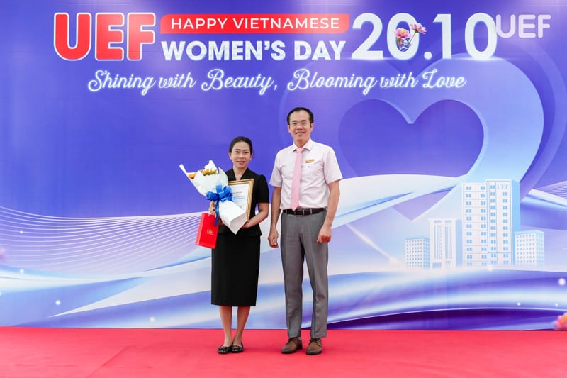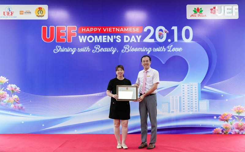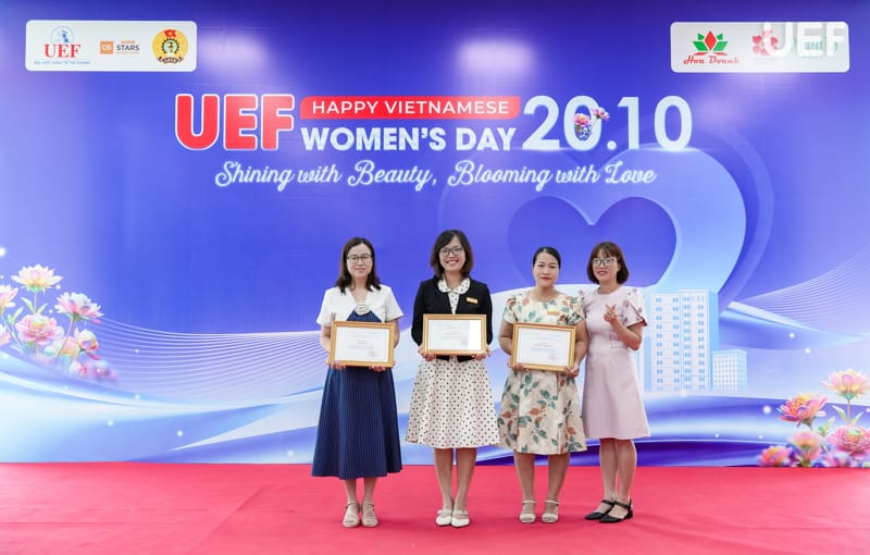 Trong khuôn khổ chương trình, Nhà trường cũng khen thưởng và tôn vinh các nữ CB-GV-NV tiêu biểu, những người đã có nhiều đóng góp tích cực cho sự phát triển của UEF. Theo đó, ThS. Nguyễn Thị Nguyệt Hoàng - Phó Trưởng phòng Công tác sinh viên đã nhận Bằng khen của Liên đoàn Lao động TP.HCM vì có thành tích hoàn thành xuất sắc nhiệm vụ giai đoạn 2020 - 2025. Bên cạnh đó, nữ CB-GV-NV tiêu biểu trong năm học vừa qua tại UEF được vinh danh có: TS. Tăng Mỹ Hà - Phó Trưởng khoa Kinh tế, ThS. Hoàng Thị Ngọc Hiền - Trợ lý Trưởng khoa Tiếng Anh, cô Nguyễn Thị Hồng Vân - Phòng Quản trị.