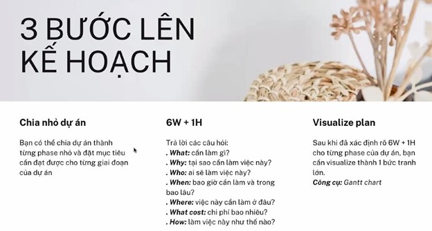 Khách mời đã nhấn mạnh tầm quan trọng của việc dành thời gian làm kế hoạch, trong đó có 3 yếu tố: thứ nhất, lập kế hoạch giúp cụ thể hóa mục đích, lý do và quy trình để hành động; thứ hai, dựa vào kế hoạch, tập thể sẽ nhận ra những đầu việc cần ưu tiên và tập trung thực hiện; thứ ba, kiểm soát và hoạch định được những phát sinh khác trong quá trình thực hiện.
