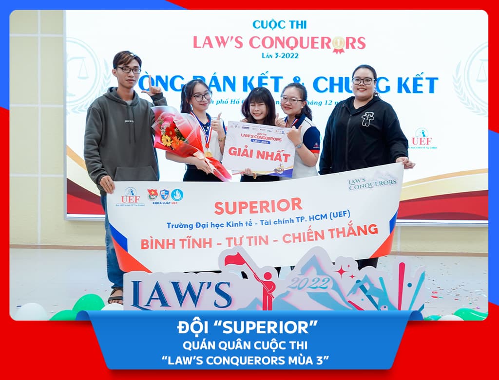 Lựa chọn từ 34 đội thi đến từ 14 trường đại học ở vòng Sơ loại, 12 đội thi đã bước vào vòng Bán kết cuộc thi “Law’s Conquerors mùa 3”. Trải qua các thử thách: Khởi động, Vượt chướng ngại vật và Về đích, 4 đội có phần thể hiện xuất sắc nhất đã tiếp tục tranh tài tại vòng Chung kết. Vượt qua các đối thủ nặng ký, đặc biệt thể hiện khả năng ngoại ngữ vượt trội, đội “SUPERIOR” của UEF đã chinh phục ngôi vị Quán quân mùa giải năm nay.
