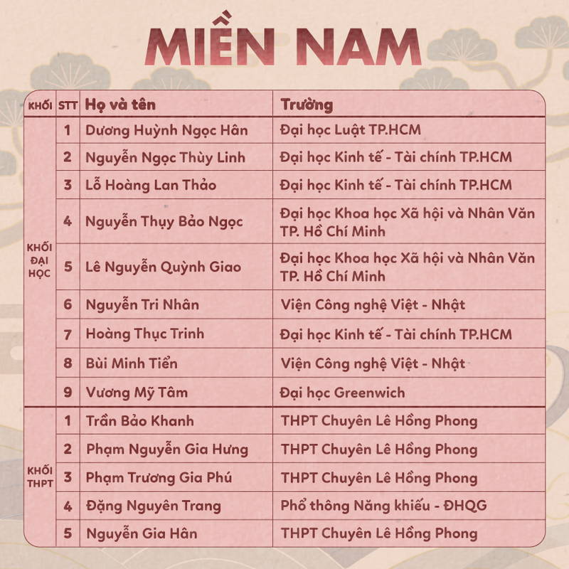 Vòng sơ khảo miền Nam có sự tham gia của 14 thí sinh, gồm 9 thí sinh nhóm đại học và 5 thí sinh nhóm THPT đến từ khắp các trường trên toàn quốc.