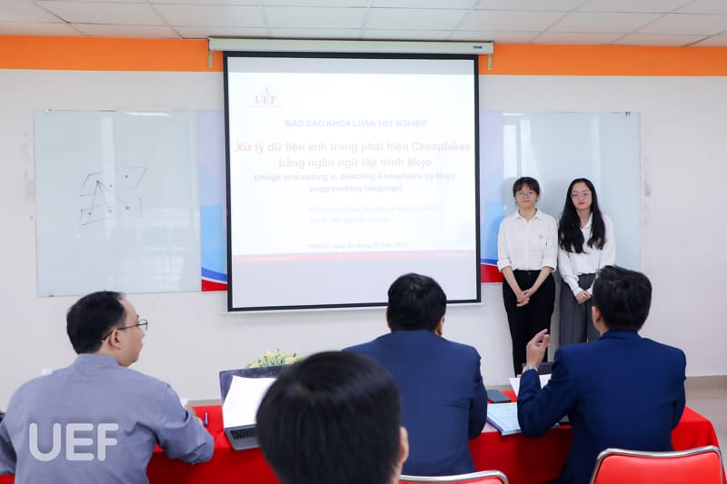 2 đề tài khóa luận ngành Khoa học dữ liệu được bảo vệ thành côngCó 2 đề tài khóa luận của ngành này được bảo vệ: (1) Xử lý dữ liệu ảnh trong phát hiện Cheapfakes bằng ngôn ngữ lập trình Mojo - Đoàn Phạm Thảo Như và Nguyễn Linh Chi, (2) Sử dụng ngôn ngữ Mojo xử lý dữ liệu chú tích trong phát hiện Cheapfakes - Trần Thanh Phương và Lý Gia Bảo.