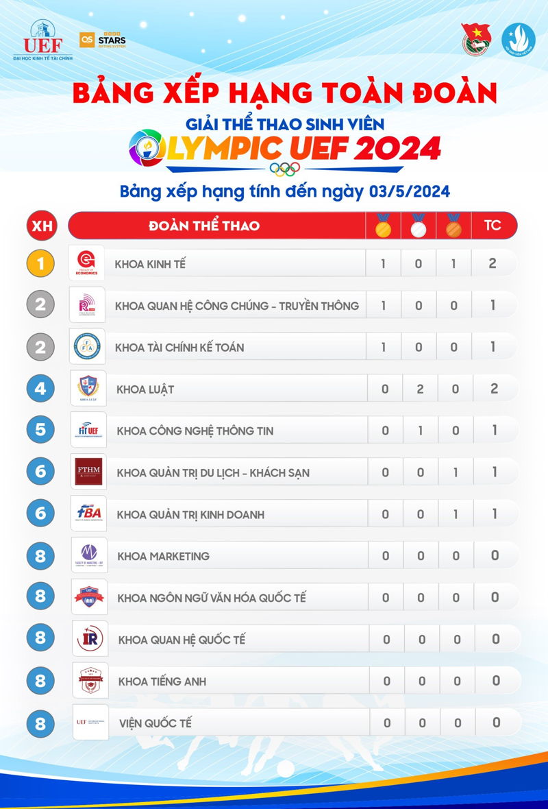 Nhà UEF cùng đón chờ xem những trận tranh tài nảy lửa đến từ các Khoa, Viện từ ngày 12/5. Lần lượt các bộ môn thi đấu khác như Kéo co, Bóng chuyền, Bóng rổ, Aerobic,... cũng khởi tranh ngay sau đó. UEFers hãy ghi nhớ lịch thi đấu và sắp xếp thời gian đến cổ vũ cho các đội thi năm nay để cùng nhau tạo nên sự hứng khởi và khí thế cho mỗi trận tranh tài các bạn nhé!