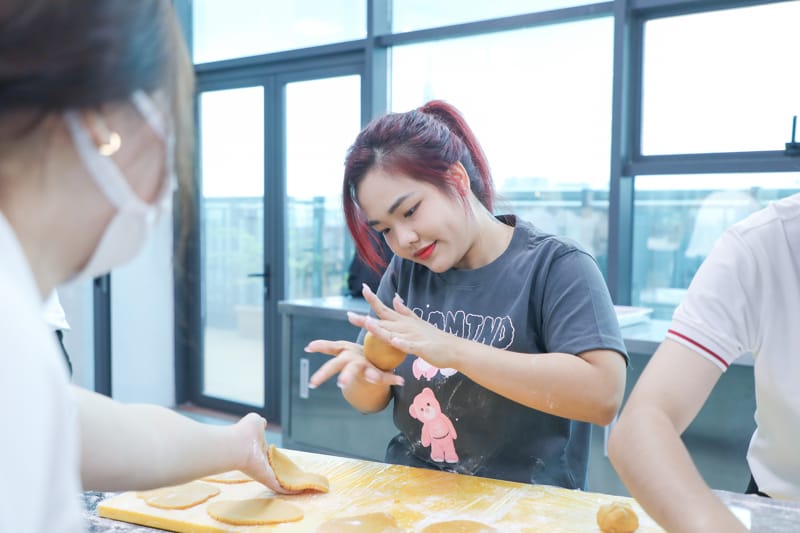 Tại chương trình, các bạn đã được Đầu bếp Nguyễn Lâm Khang hướng dẫn từng bước trong quy trình làm bánh Trung thu gồm: chuẩn bị nguyên vật liệu, làm vỏ bánh nướng, làm nhân bánh, dập khuôn bánh, nướng bánh và đóng gói thành phẩm.