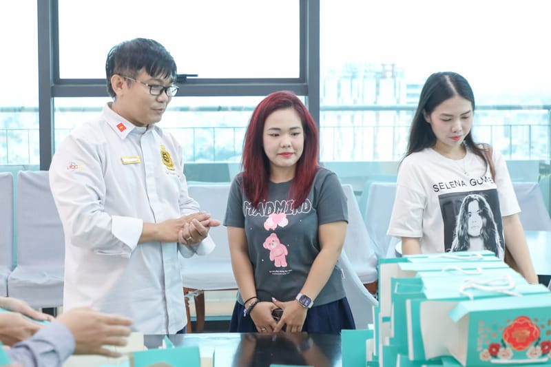 Đồng hành với sinh viên trong hoạt động này là Đầu bếp Nguyễn Lâm Khang - Phó phòng Đào tạo Công ty Nhất Hương, chuyên cung cấp nguyên liệu làm bánh và nấu ăn, đào tạo khóa học về nghề bánh. Đặc biệt, buổi làm bánh có sự xuất hiện của chị Phạm Thu Hường, TikToker “Babykopohome” với 6.6 triệu người theo dõi.