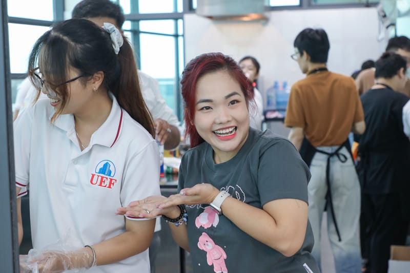 Tham gia làm bánh cùng sinh viên, TikToker Babykopohome cũng bày tỏ cảm xúc thích thú: “Chương trình này rất hay khi mang tính xã hội cao nên tôi quyết định tham gia cùng các bạn sinh viên UEF. Khi đến trường, tôi cũng khá bất ngờ về cơ sở vật chất tại đây, đặc biệt là khu vực làm bếp rất sạch sẽ và đạt tiêu chuẩn. Các bạn sinh viên rất nhiệt huyết, thầy cô thì hướng dẫn tận tình. Thông qua hoạt động xã hội này, tôi hy vọng các bạn học hỏi được nhiều kỹ năng cần thiết. Đây là hành trang để các bạn bước vào đời, sống và làm việc với tinh thần tích cực”.