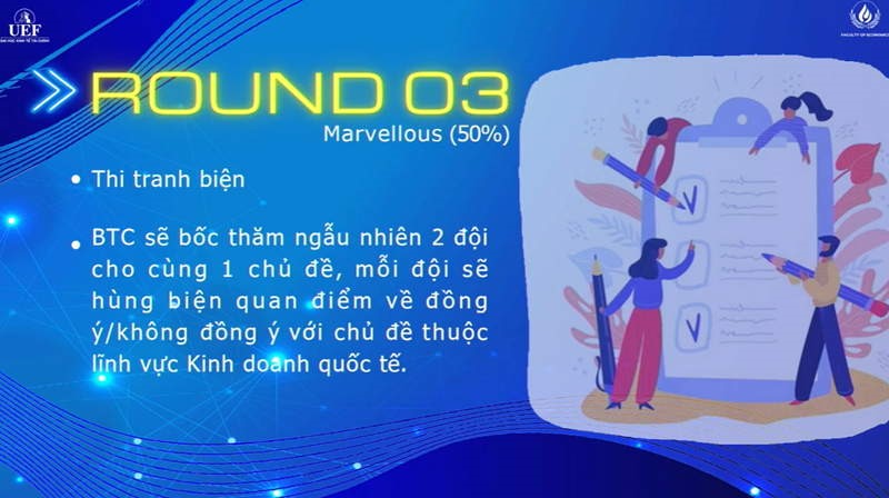 - Vòng Chung kết “Biện luận": Diễn ra từ ngày 16 - 17/4/2022 với nội dung gồm 3 phần: Trắc nghiệm kiến thức nhanh, Giải pháp kinh doanh, Debate - biện luận.