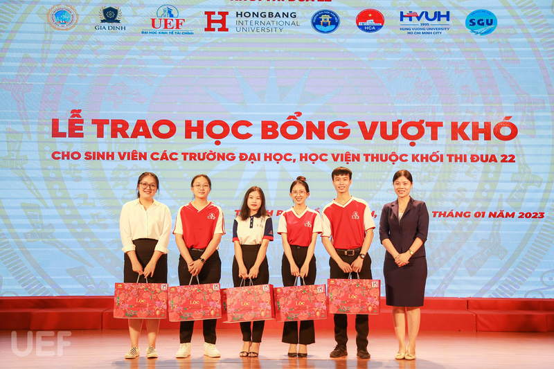 Trong chương trình, UEF đã trao tặng 5 suất học bổng (mỗi suất trị giá 1.000.000 đồng) cùng với đó là 5 phần quà Tết (mỗi phần trị giá 300.000 đồng) cho 5 sinh viên có hoàn cảnh khó khăn. Điều này thể hiện sự quan tâm, động viên của Nhà UEF đến sinh viên, mong các bạn sẽ luôn nỗ lực và đạt thành tích cao trong học tập, rèn luyện.