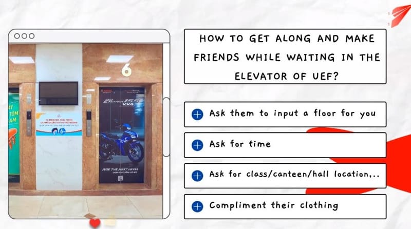 Theo đó, một số nơi UEFers dễ dàng để tạo mối quan hệ mới là thang máy (cách được dùng phổ biến là nhờ bấm thang giúp), thư viện (phương pháp hay được sử dụng là nhờ chỉ chỗ lấy quyển sách đối phương đang đọc) và môi trường câu lạc bộ (hỏi thông tin cơ bản của đối phương là cách được nhiều lựa chọn nhất).