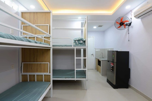 - Trang bị nội thất mới, không gian thoáng mát gồm: Giường, nệm, tủ quần áo, tủ lạnh, máy lạnh, nhà vệ sinh riêng mỗi phòng.
