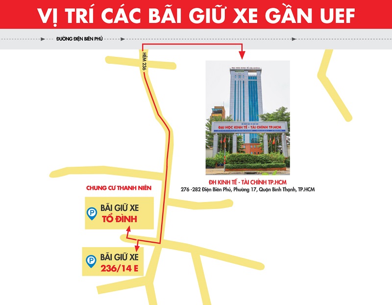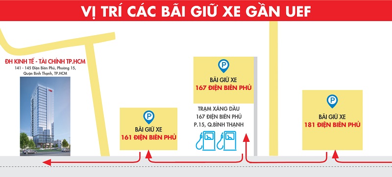 Sinh viên sẽ quan tâm khi đi học trực tiếp là việc gửi xe. Theo đó, tại trụ sở 141 Điện Biên Phủ, bên cạnh tầng hầm, các bạn còn có thể gửi xe tại bãi giữ xe 161 Điện Biên Phủ, 167 Điện Biên Phủ và 181 Điện Biên Phủ (xem sơ đồ). Với cơ sở 276 Điện Biên Phủ, ngoài tầng hầm, sinh viên còn có thể gửi tại bãi giữ xe Tổ Đình và bãi giữ xe 236/14E Điện Biên Phủ (xem sơ đồ).
