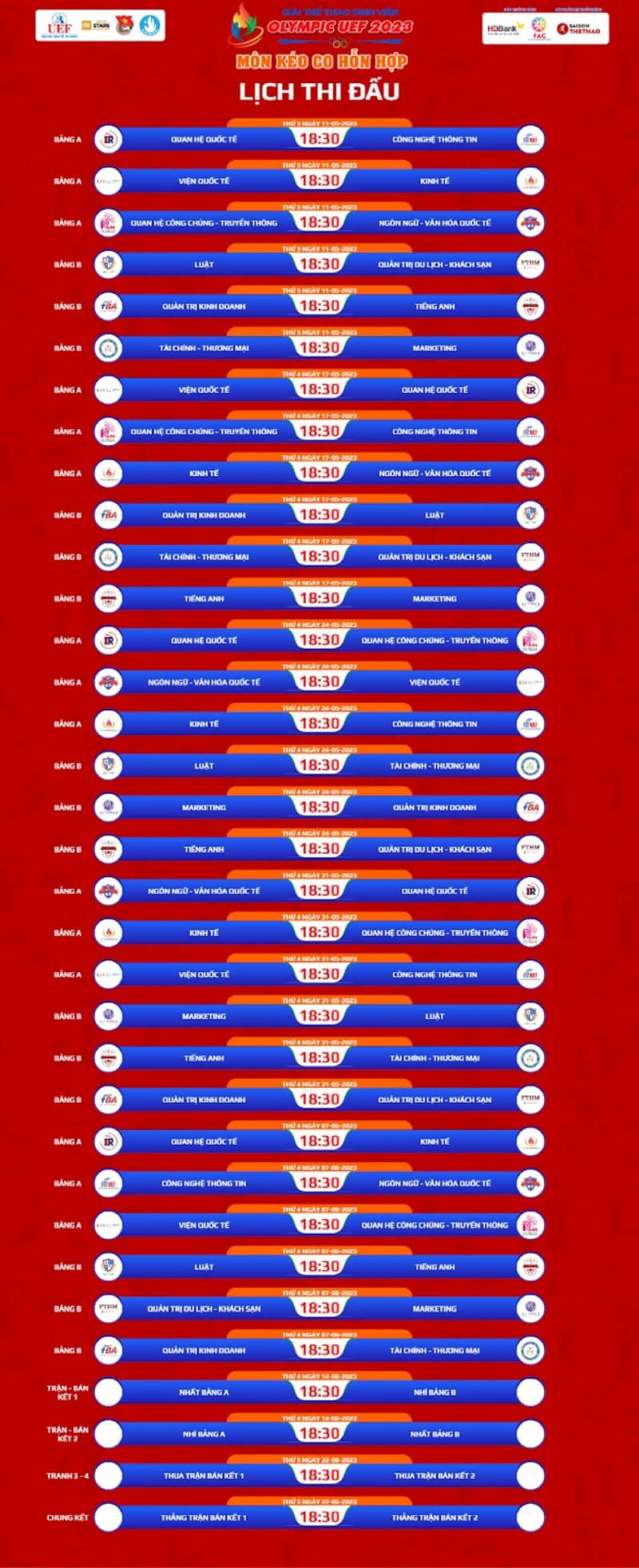 Có thể thấy rằng Olympic UEF 2023 đã và đang khẳng định vai trò trong việc tạo ra sân chơi lành mạnh để các bạn sinh viên rèn luyện thể lực, cùng nhau trải nghiệm và thử thách. Hành trình vượt qua bản thân của UEFers sẽ như thế nào? Đội thi nào sẽ bứt phá và giành được ngôi vị cao nhất trong cuộc đua về đích của bảng đội tuyển năm nay? Thứ 5 - ngày 11/5 sắp tới sẽ diễn ra trận tranh tài đầu tiên của các đội thi trong Bảng A, bộ môn Kéo co. Các bạn sinh viên hãy lưu ý lịch thi đấu để tham gia cổ vũ cho đội thi mà mình yêu thích nhé. Tin chắc rằng với sự chuẩn bị tỉ mỉ cùng tinh thần quyết đấu, quyết thắng của mình, các đội sẽ mang đến những phần thể hiện ấn tượng.