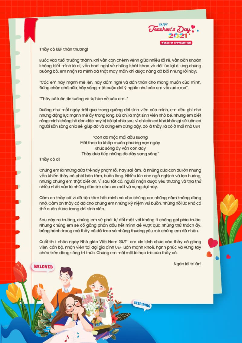 Ngày Nhà giáo Việt Nam 20/11 năm 2021 có lẽ đặc biệt hơn trong bối cảnh “bình thường mới”, có thể sẽ thiếu những cái ôm, những món quà, bó hoa trao tay, nhưng không thể nào thiếu sự tri ân, lòng tôn kính với lời yêu thương mà “đàn con” Nhà UEF dành cho các thầy cô. Những tình cảm ấy được các bạn bày tỏ qua từng con chữ đầy trân quý.