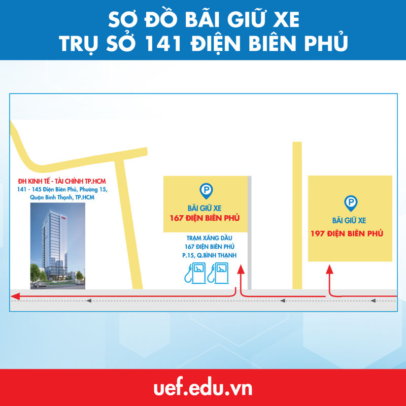 Với cơ sở 141 Điện Biên Phủ, sinh viên có thể tham khảo 2 bãi giữ xe tại địa chỉ sau: cây xăng (167 Điện Biên Phủ, cách UEF 150m), 197 Điện Biên Phủ.