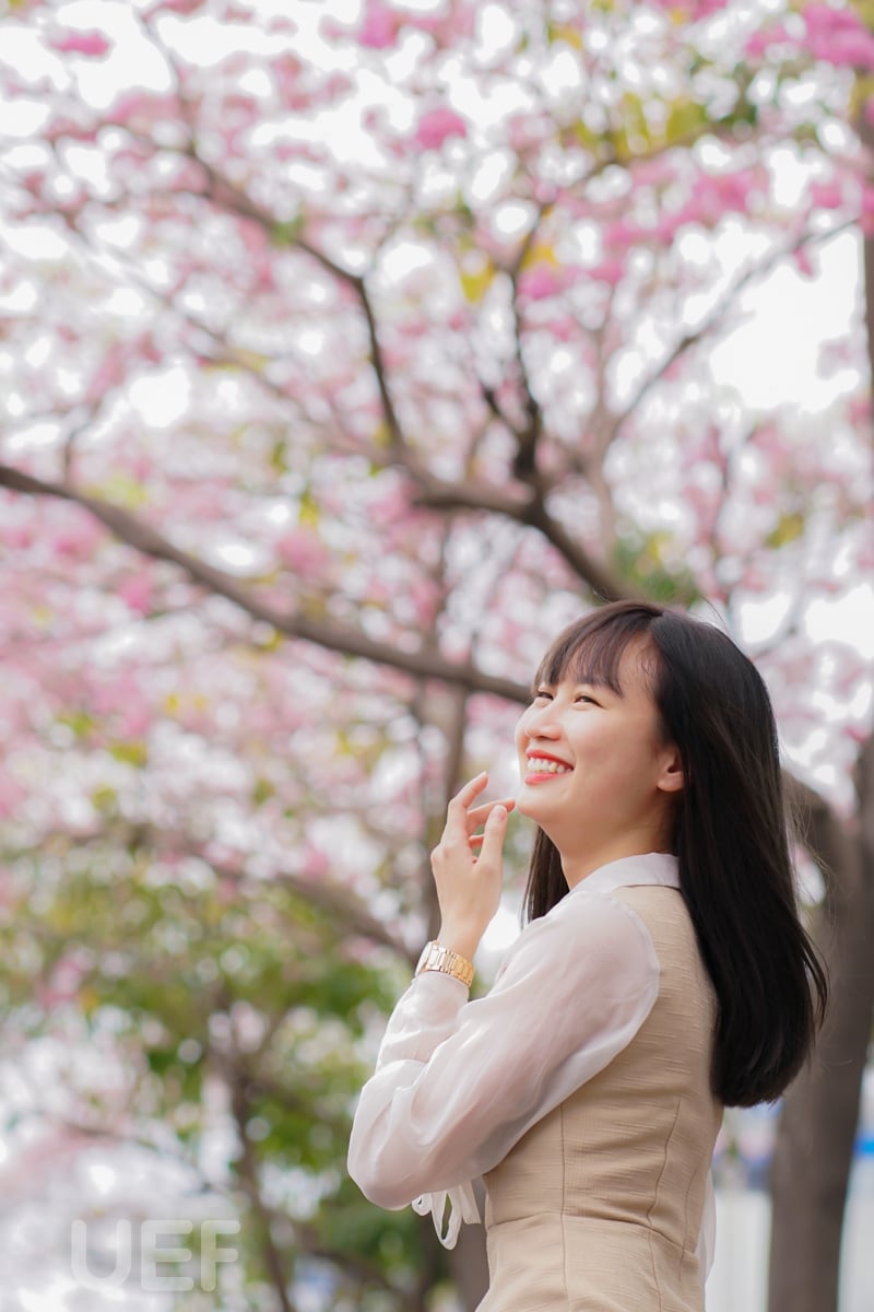 "Back to school" trong thời điểm này, UEFers có thể chụp ngay một bộ ảnh lung linh với hoa kèn hồng đang nở rộ trước cổng trường