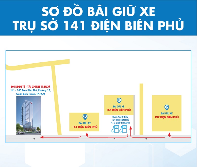 Theo đó, ở trụ sở 141 - 145, Điện Biên Phủ, bên cạnh hầm xe của Nhà trường, các bạn còn có thể gửi ở các bãi xe: Long Triệu (161 Điện Biên Phủ, cách UEF 75m); cây xăng (167 Điện Biên Phủ, cách UEF 150m); Long Triệu (197 Điện Biên Phủ, cách UEF 350m).