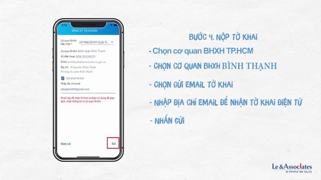 Sinh viên lưu ý chọn Cơ quan BHXH tiếp nhận là BHXH TP.HCM, cơ quan BHXH Quận Bình Thạnh, chọn gửi email tờ khai, nhập địa chỉ email để nhận tờ khai điện tử rồi nhấn “Gửi”. Màn hình ứng dụng sẽ hiển thị thông báo tờ khai điện tử đã được gửi đến cơ quan BHXH, đồng thời gửi vào email bạn cung cấp.