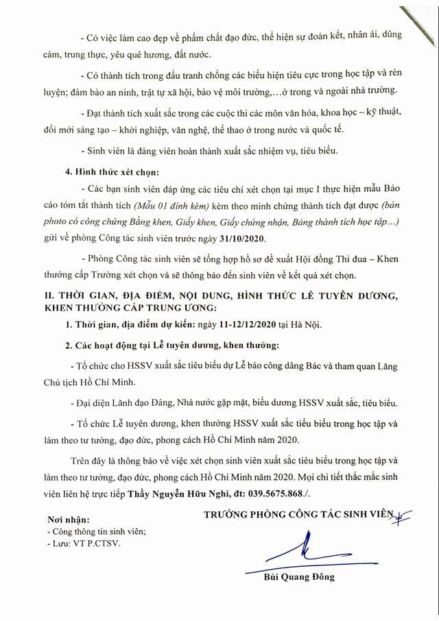Căn cứ Công văn số 4371/BGDĐT-GDCTHSSV ngày 21 tháng 10 năm 2020 của Bộ Giáo dục và Đào tạo về việc tổ chức xét chọn, tuyên dương HSSV xuất sắc tiêu biểu trong học tập và làm theo tư tưởng, đạo đức, phong cách Hồ Chí Minh năm 2020 và sự chỉ đạo của Ban Giám hiệu Nhà trường, Phòng Công tác sinh viên thông báo đến các bạn sinh viên về việc xét chọn: