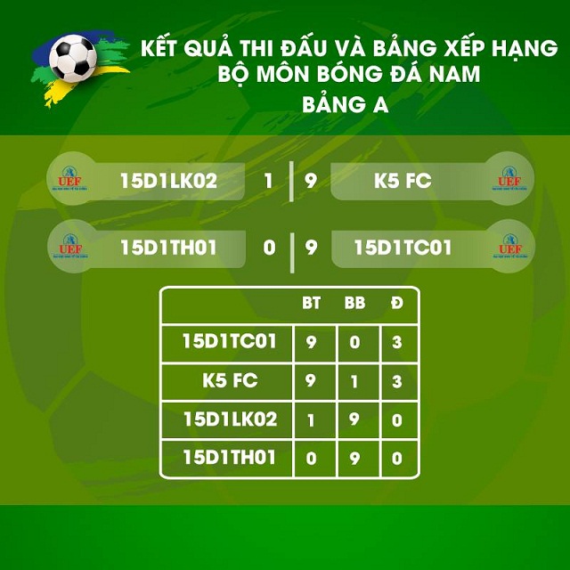 Theo Ban tổ chức, chiều nay (16/3), trận đấu giữa UEF K5 FC và 15D1QT5 thuộc bảng C bóng đá nam (17h00) cùng trận khai mạc bóng đá nữ giữa đội 14D1QD01 - 14D1TC01 (16h00) sẽ tiếp tục diễn ra tại sân bóng đá Marina. Hy vọng các cổ động viên yêu thích môn thể thao vua sẽ không bỏ lỡ những khoảnh khắc tranh tài ấn tượng, kịch tính. Sự hiện diện của các bạn chính là nguồn động viên to lớn, giúp các cầu thủ thi đấu với tinh thần thoải mái và “máu lửa” nhất!