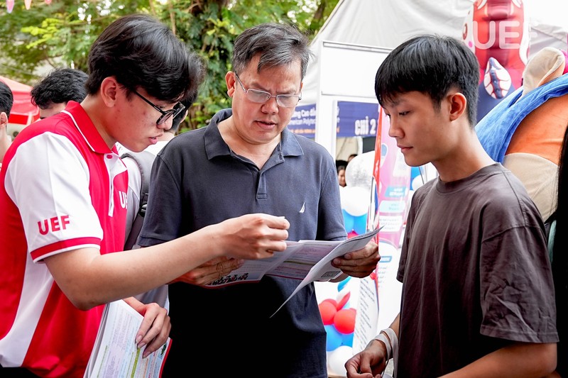 Arriving early at UEF’s consultation booth, Tran Thanh Nhan, a student from Chu Van An High School (An Giang), eagerly registered for an early scholarship at UEF, aiming to enhance his chances of university admission. "I am highly impressed by UEF’s training environment, which offers numerous internship opportunities both domestically and internationally," he shared.