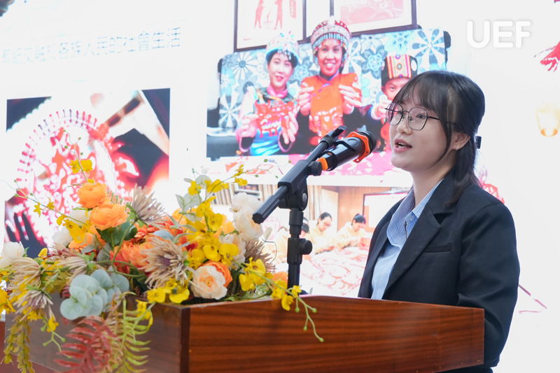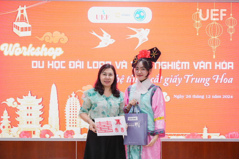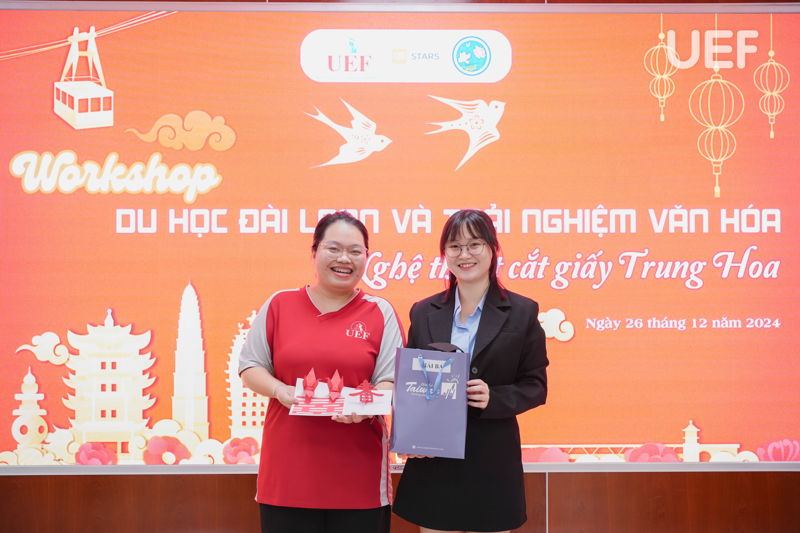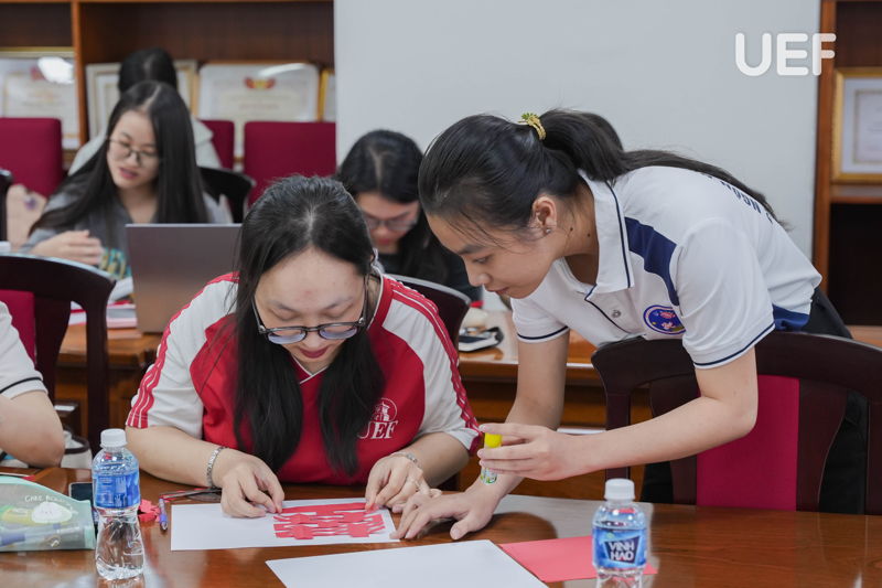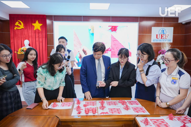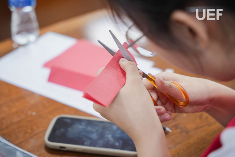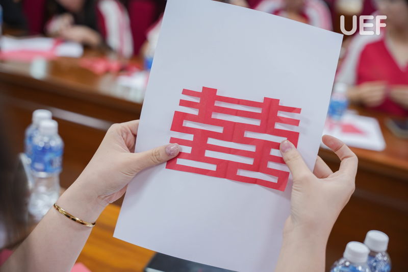 During the workshop, UEFers continued to discover and experience the art of Chinese paper-cutting under the sharing and guidance of Mrs. Nguyen Vo Han Diep Uyen. The speaker gave a brief overview of the history and development of the folk art, then followed by directly guiding the students in cutting the basic shapes.