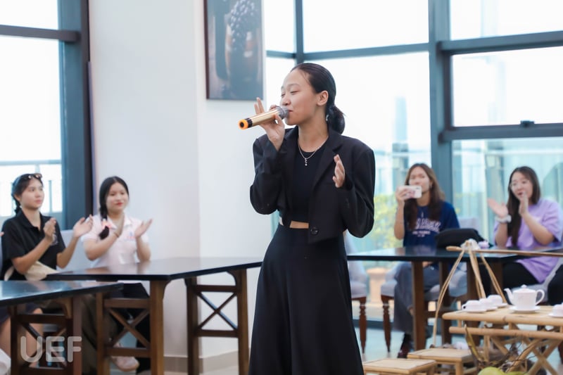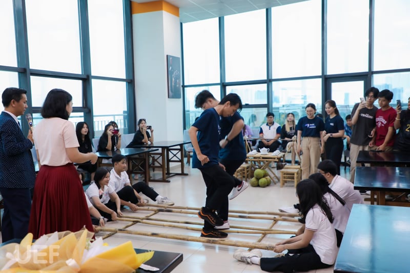 In the lively and enthusiastic atmosphere, students from the two universities quickly immersed themselves in the special musical performances. Each song was sung with a clear, gentle voice, connecting kindred spirits. In addition, during the meet-up, UEF students brought a unique series of Vietnamese traditional folk games such as cheraw dance, dance to the music, and blowing balloons blowing creating a joyful and intimate atmosphere for students from the two universities.