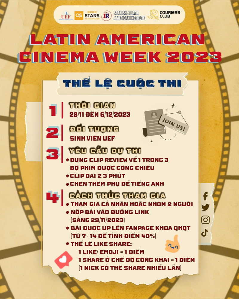 In the opening program, the Latin American movie review contest was also launched. After watching the 3 featured movies in this event, contestants will choose a movie to make their own reviews in video format, lasting no more than 5 minutes. Students can compete individually or in groups of no more than 2 members. The contest organizers will officially accept entries from November 29 to December 6, followed by the voting period for review works lasting from December 7 to December 14.