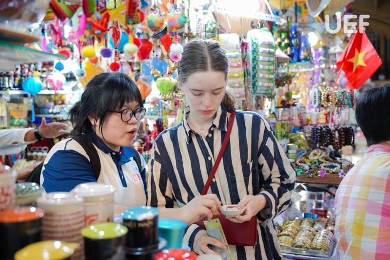 In the afternoon of the same day, the delegation continued their journey to Ben Thanh Market - a long-standing iconic landmark of Ho Chi Minh City. International students experienced the bustling shopping atmosphere, directly observed and selected exquisite handicrafts and souvenirs imbued with Vietnamese identity.