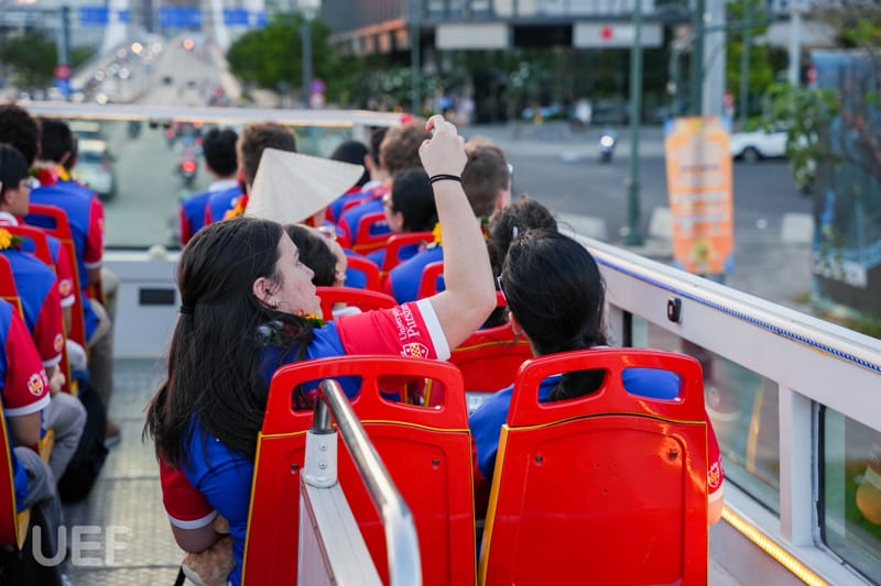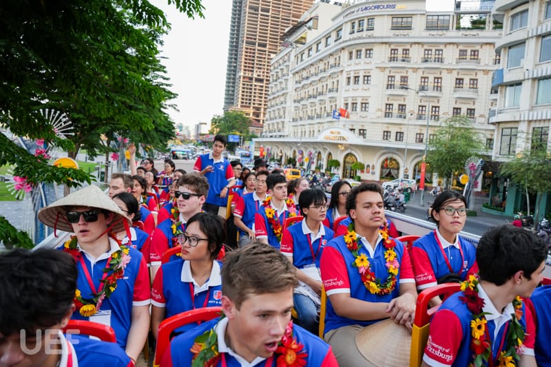 Embarking on an exciting journey on a double-decker bus, the Pitt students had the opportunity to admire the beauty of Ho Chi Minh City in the late afternoon. With the assistance of UEFers, they also gained more information about the sightseeing spots such as the City Theater, Bach Dang Wharf, Nguyen Hue Walking Street, and more.