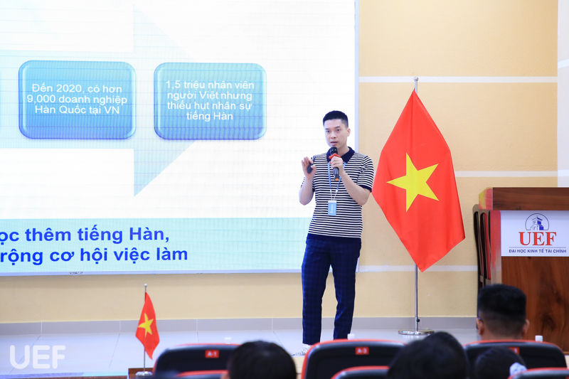 During the workshop, the speaker shares 5 basic issues: challenges in the language major, job opportunities for Korean-major students, the reasons for choosing Master Korean, recruitment requirements of businesses and good CV writing skills.