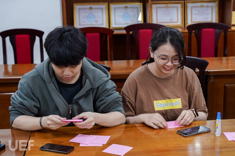 The students watched a video tutorial before trying their hand at making cherry blossom flowers, a symbol of spring in Japan. Using the provided materials, such as craft paper and tape, the UEFers let their creativity shine as they cut, folded, and assembled their flowers. They focused intently on the task at hand, and tried their best to create a perfect Origami.