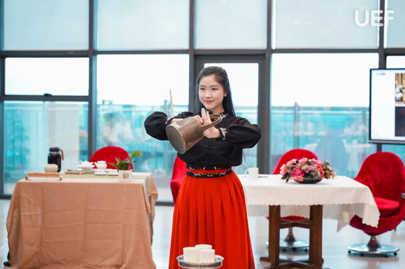 Before concluding the workshop, UEF students explored the characteristics of various types of tea, how to select tea for different occasions, and proper tea-brewing techniques. The hands-on session—featuring tea preparation, serving, and situational role-playing—helped students develop observational skills, adaptability in communication, and the ability to convey goodwill through thoughtful, subtle gestures.