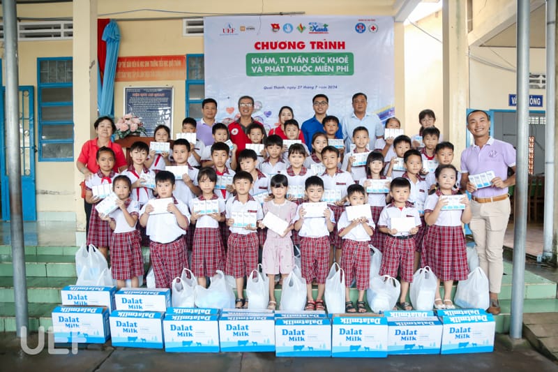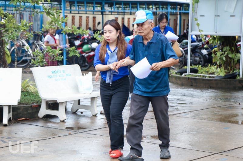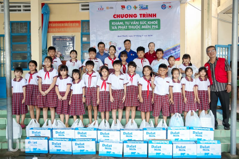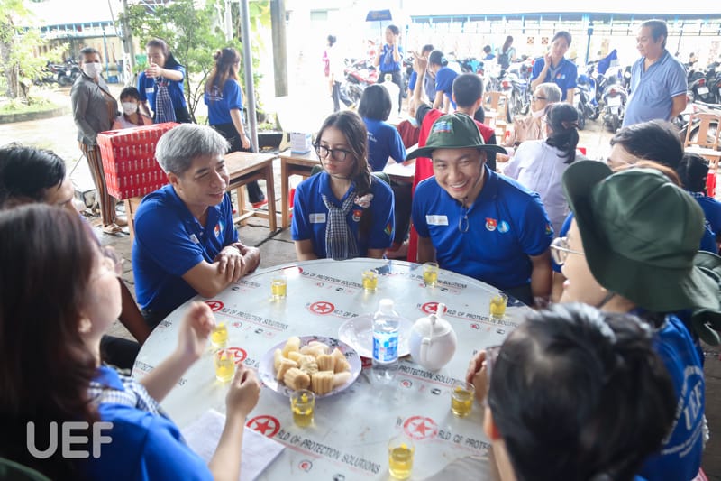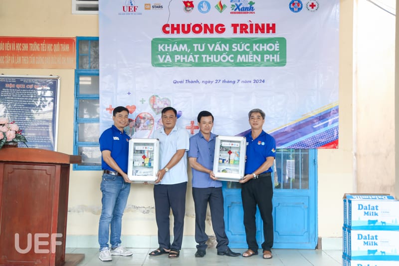 TS. Nguyễn Thanh Giang cùng các thầy, cô Nhà UEF động viên tinh thần các chiến sĩ áo xanhChương trình “Khám, cấp phát thuốc cho 300 bà con xã Quới Thành” trong khuôn khổ của chiến dịch cũng đã diễn ra với sự phấn khởi của người dân địa phương. Phối hợp với đoàn y, bác sĩ của Bệnh viện Hùng Vương, các chiến sĩ áo xanh đã hỗ trợ hướng dẫn, giúp đỡ các cô chú lớn tuổi để quá trình khám bệnh được diễn ra thuận lợi. Trong chương trình, Ban tổ chức cũng đã trao tặng 100 phần quà gồm sữa tươi cho thiếu nhi xã Quới Thành và trao tặng 2 tủ thuốc y tế cộng đồng cho UBND xã Quới Thành.
