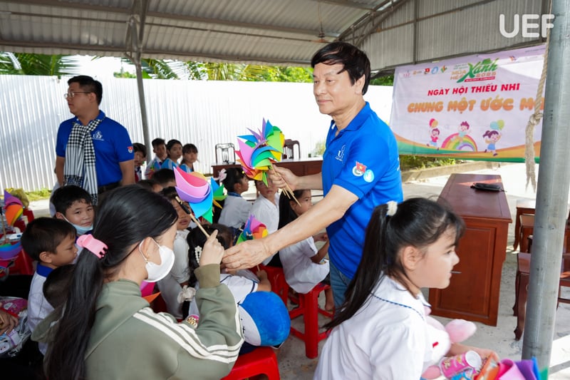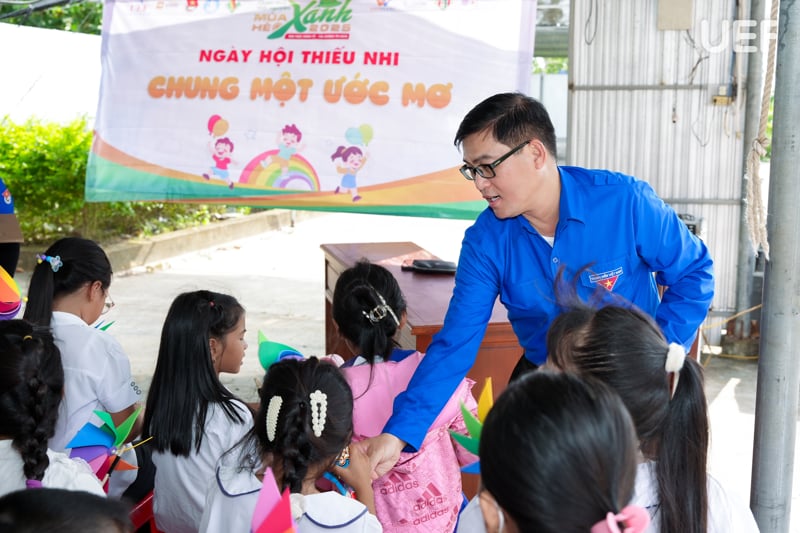 Hòa trong không khí rộn ràng của buổi lễ khánh thành công trình thanh niên, các chiến sĩ Mùa hè xanh UEF cũng đã tổ chức ngày hội thiếu nhi “Chung một ước mơ” dành tặng các em nhỏ tại địa phương. Những phần quà ý nghĩa được trao gửi kèm theo đó là các hoạt động giao lưu, sinh hoạt vui nhộn cùng các chiến sĩ và thầy cô UEF, mang đến một ngày trọn vẹn tiếng cười, sự sẻ chia và tình cảm ấm áp.