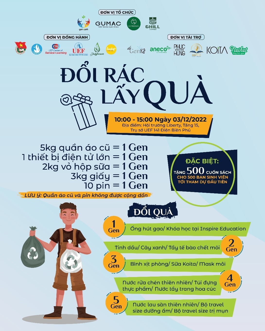 Bên cạnh talkshow chia sẻ, sự kiện lần này còn có hoạt động đáng chú ý - “Đổi rác lấy quà”. Thông qua việc thu gom và mang đến những đồ dùng không còn sử dụng với số lượng quy định, các bạn sinh viên sẽ nhận được những món quà “xanh” đáng yêu từ chương trình, đồng thời góp phần vào việc tái chế rác thải.