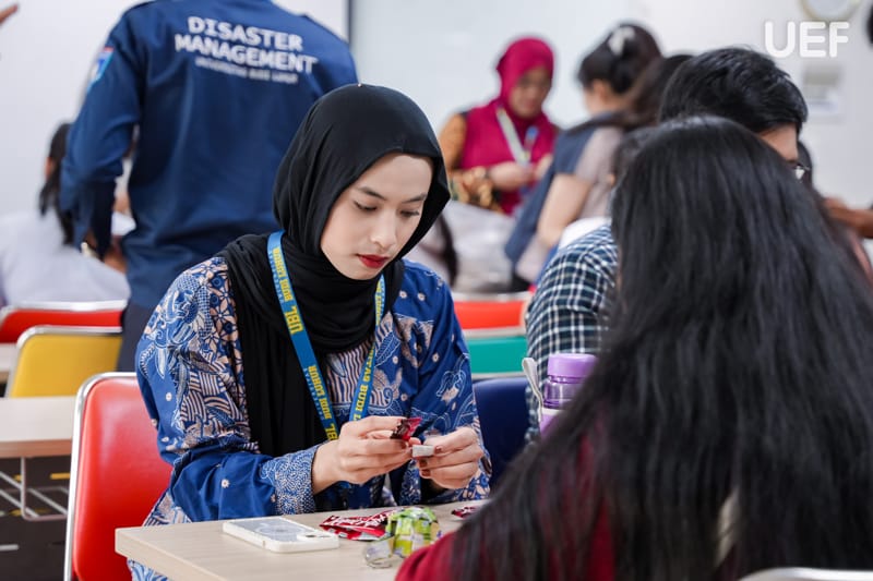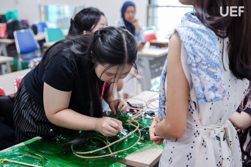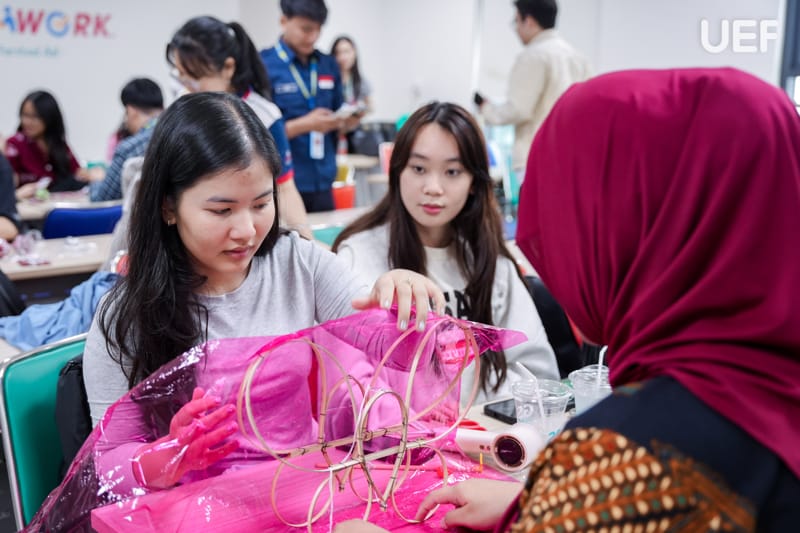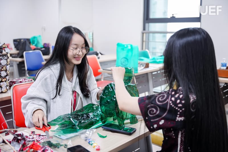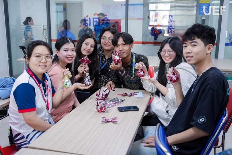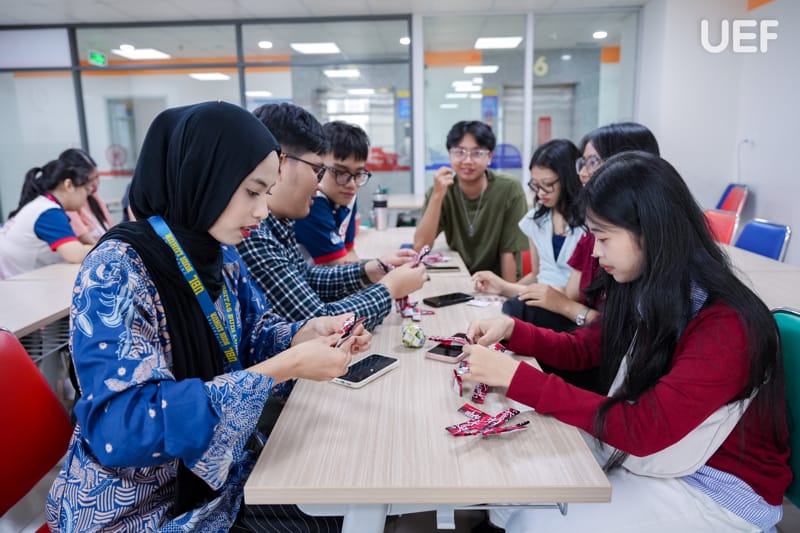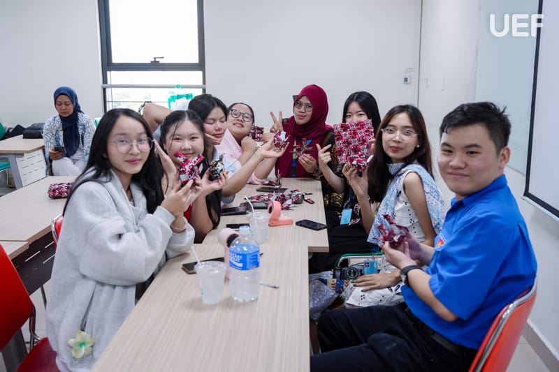 Indonesian students shared and guided UEFers in weaving items from used candy wrappers. Through careful and skillful steps, the groups created charming handmade products. During the process, UEF students also practiced and improved their foreign-language communication skills.