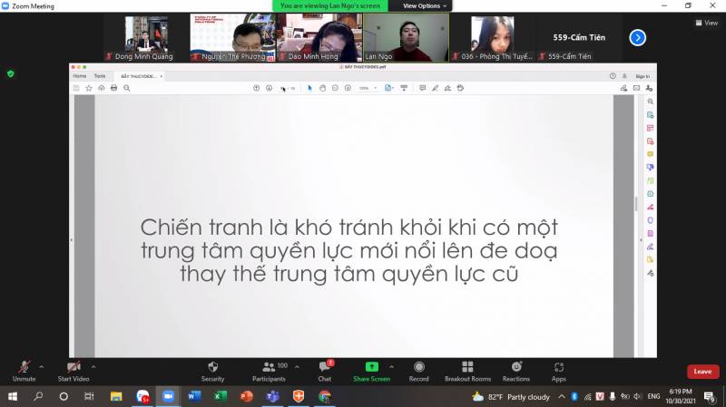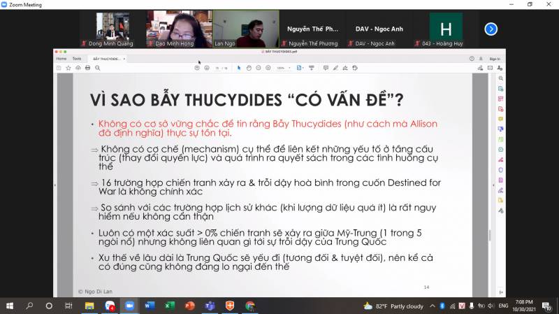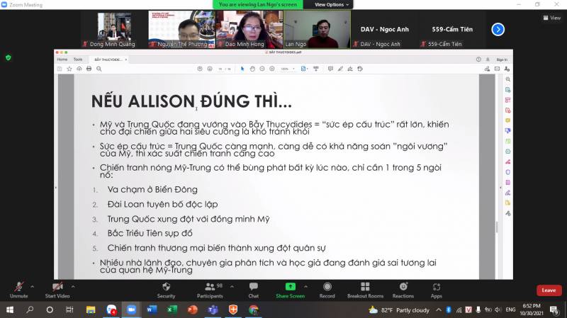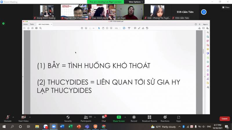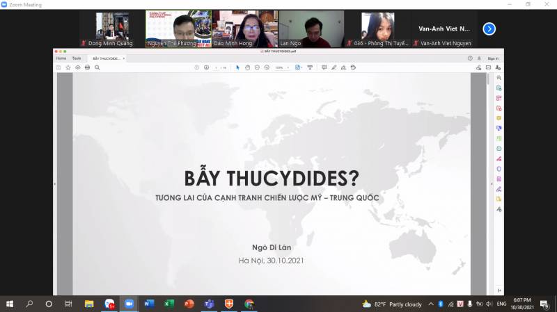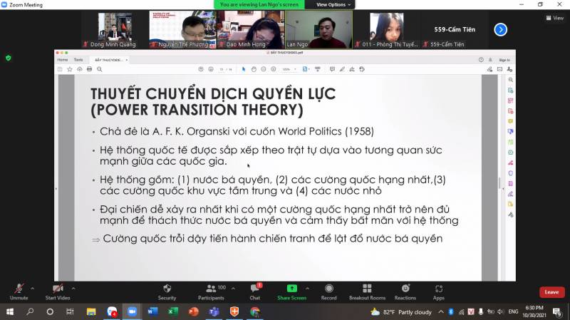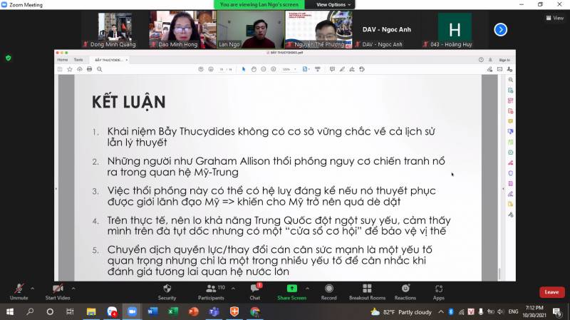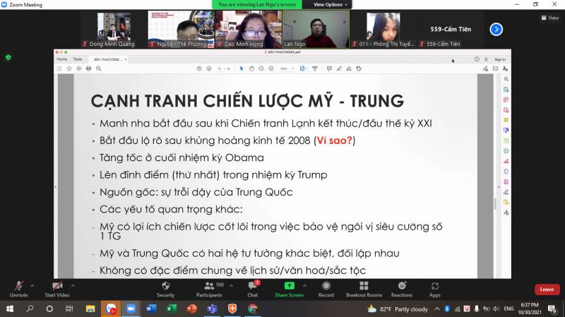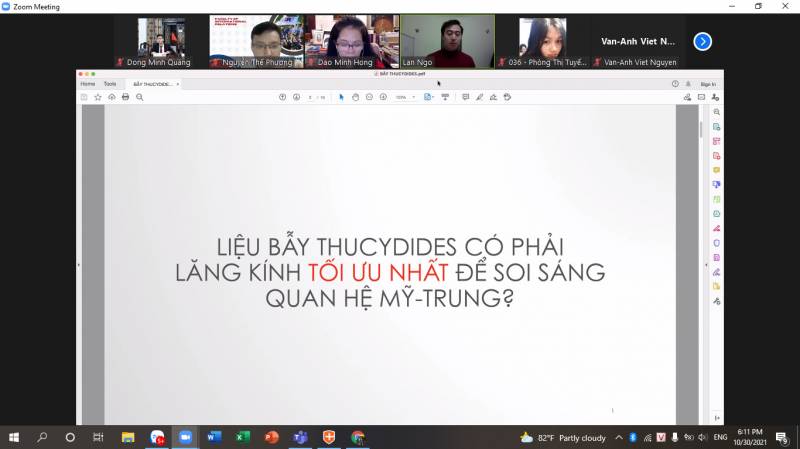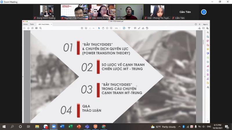 In order to create conditions for students to deepen their understanding of the concept of the Thucydides Trap, the views for and against it, and its impact on the US-China strategic competition, and to increase general awareness of students on US foreign policy, on the impact of US-China competition on the security situation of the Indo-Pacific region, Faculty of International Relations organized the Symposium Report: "Thucydides trap and US-China strategic competition" at 18:00, Saturday, October 30, 2021 by online form via Zoom platform.