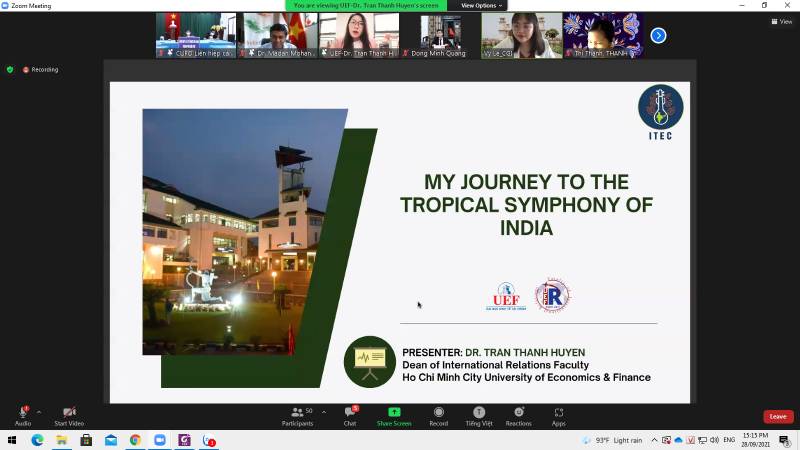 Especially, right after the speech of the Consul General, the Faculty of International Relations of UEF was honored to have the participation and speech of Dr. Tran Thanh Huyen, Dean, Faculty of International Relations. Dr. Tran Thanh Huyen is an alumnus of ITEC in the Course "Leadership 4.0: Management and Governance in the Emerging World of disruption" at Kozhikode Academy of Personnel Management.