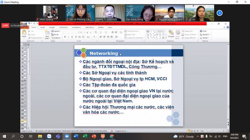 The speaker provided students with a model of a networking system that you should be interested in: domestic foreign affairs departments, provincial and municipal foreign affairs departments, multinational corporations, and Vietnamese diplomatic missions in foreign. Besides, about opportunities for personal development, the speaker shared that students focus on seeking opportunities to foster foreign languages, expertise, politics, and foreign work/