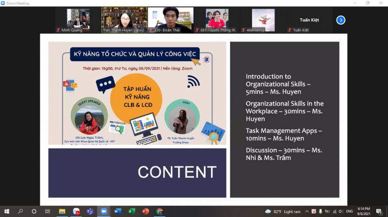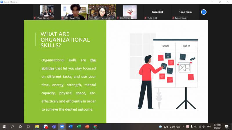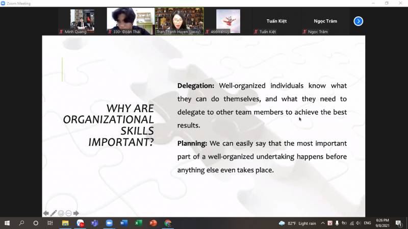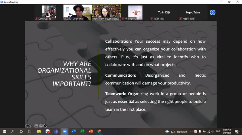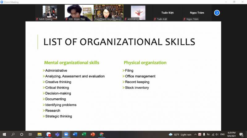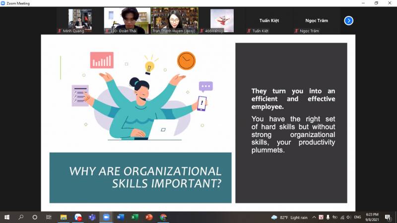 Dr. Tran Thanh Huyen emphasized the importance of organizational skills through the following factors: improved work performance; improved human-to-human cooperation; increasing the ability to interact, communicate, exchange, and discussed with partners and colleagues; minimized unproductive work habits such as procrastination, losing your temper, and not understanding each other.