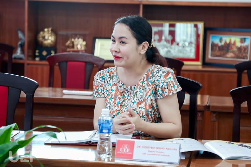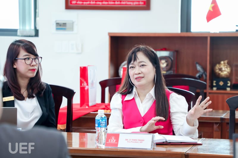 Trong buổi trao đổi, TS. Lý Thiên Trang đã điểm qua những khía cạnh nổi bật trong chương trình đào tạo của UEF, cũng như mục tiêu giúp sinh viên phát triển toàn diện, hướng đến hình mẫu công dân toàn cầu. Mô hình đào tạo gắn liền thực tiễn, chú trọng rèn luyện kỹ năng mềm cho sinh viên cũng được cô đề cập, giúp đối tác hình dung rõ hơn về phương pháp giảng dạy tại UEF.