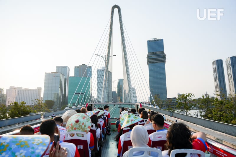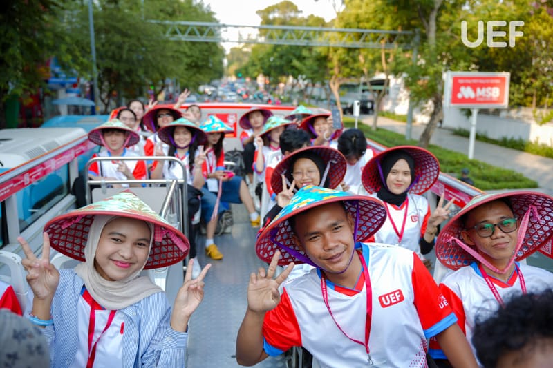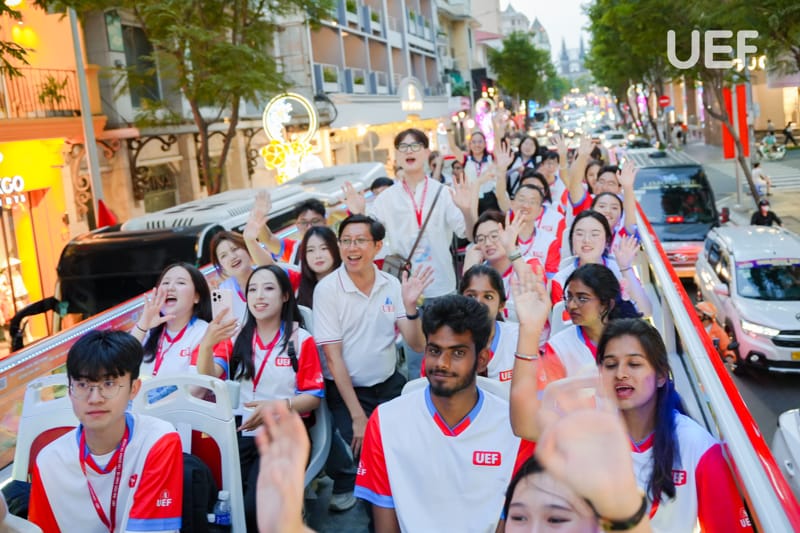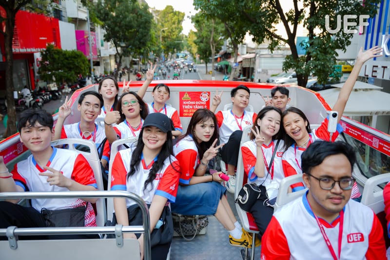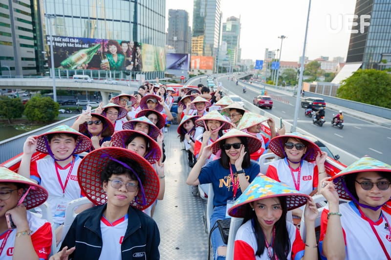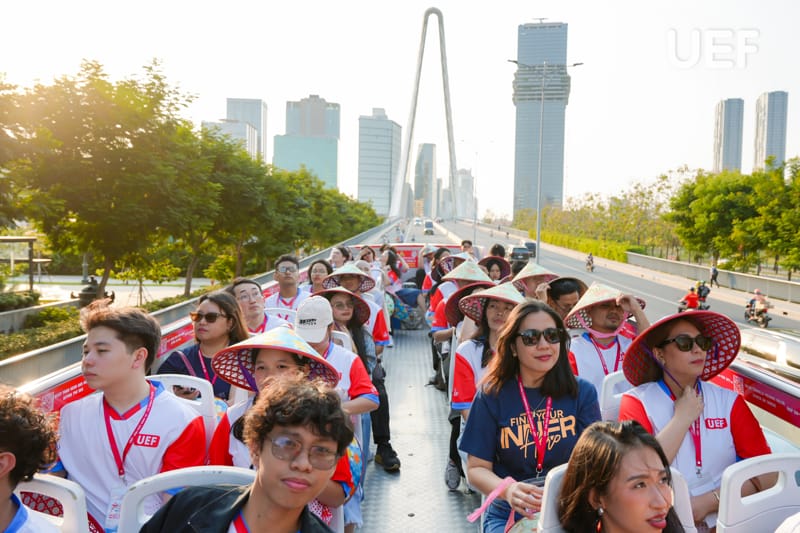Sau buổi học tập thực tế tại doanh nghiệp, sinh viên các nước tiếp tục khám phá TP.HCM bằng chuyến tham quan trên xe buýt hai tầng. Trải nghiệm đặt biệt mang đến sự thích thú và hào hứng cho sinh viên quốc tế. Quá trình tham quan cũng giúp các bạn hiểu thêm về cuộc sống, cơ sở hạ tầng và điểm đến nổi bật tại thành phố năng động bậc nhất Việt Nam.