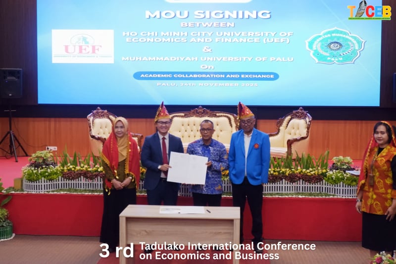 Nhân dịp tham dự TICEB 2025, đại diện UEF cũng đã làm việc và ký kết biên bản ghi nhớ hợp tác (MOU) với 6 trường đại học tại Indonesia, gồm: Universitas Alkhairat, Palu; Universitas Surabaya; STIE Amkop Makassar; Universitas Muhammadiyah Palu; Universitas Muhammadiya Buton; Universitas Sintuwu Maroso, Poso.
