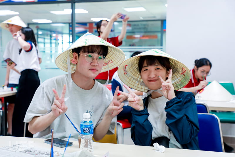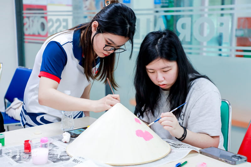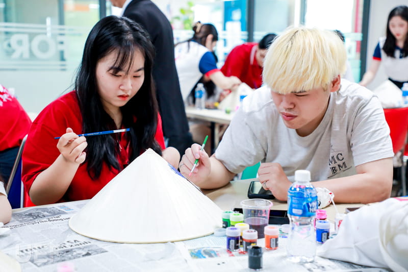 Sinh viên MCUT thực hành vẽ nón lá với sự hỗ trợ của sinh viên UEF
