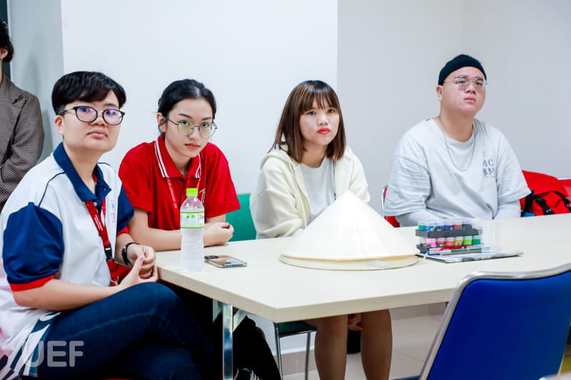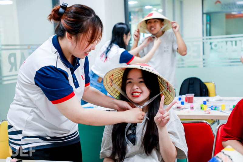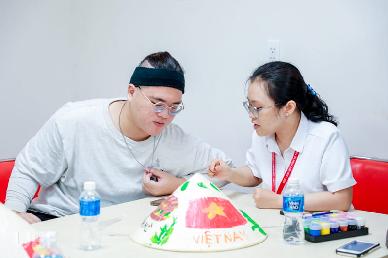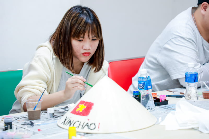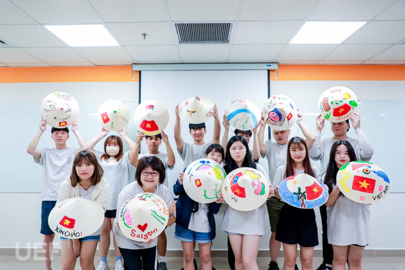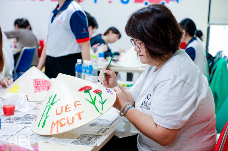Sau khi được hướng dẫn, sinh viên MCUT cùng sinh viên UEF đã thực hành vẽ nón lá, những chiếc nón được vẽ trang trí cũng là quà tặng dành cho các bạn khi trở về. Ở phần học tiếng Việt, sinh viên UEF đã hỗ trợ bạn bè quốc tế phát âm và nói được các câu giới thiệu bản thân. Dù nói chưa thật rõ ràng nhưng sinh viên MCUT rất hào hứng khi thực hiện và biểu đạt được nội dung.