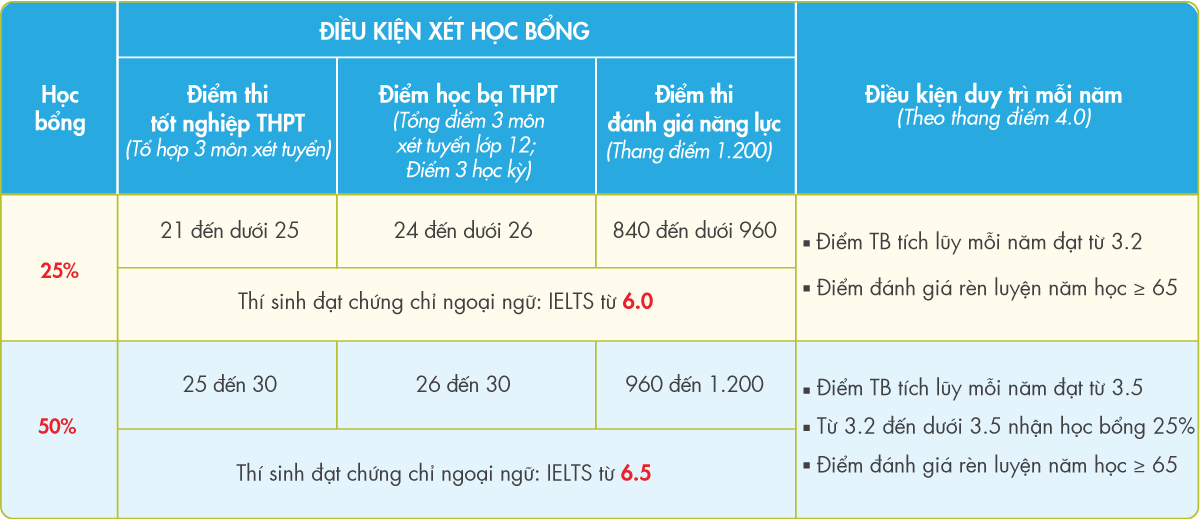 - Điều kiện nhận học bổng: Điểm thi tốt nghiệp THPT từ 25 đến dưới 27; Điểm học bạ lớp 12 từ 26 đến dưới 29; Điểm thi đánh giá năng lực 960 đến dưới 1080; IELTS từ 6.5.
