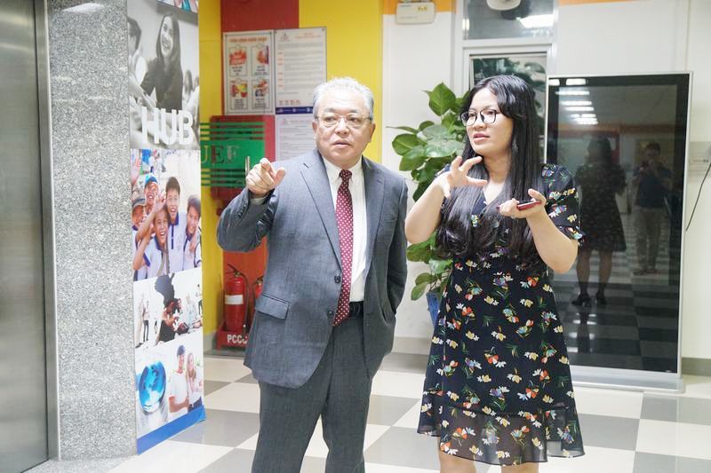 Sau buổi làm việc, đoàn Đại học Kobe đã có khoảng thời gian tham quan môi trường học tập, giao lưu, trò chuyện cùng sinh viên UEF. Không gian dạy và học giàu chất quốc tế, sự tự tin, năng động của UEFers đã để lại ấn tượng tốt đẹp với Lãnh đạo trường Đại học Kobe.