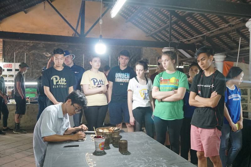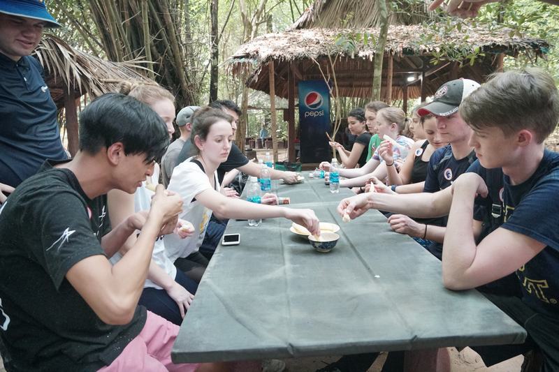 Sau phần giới thiệu của hướng dẫn viên, các bạn sinh viên Pittsburgh hứng thú trải nghiệm ngay những hoạt động khám phá như đi xuyên địa đạo, rửa mặt bằng vòi nước ống trúc, thưởng thức ẩm thực đặc sản “thời chiến” tại vùng đất này – khoai mì chấm muối mè,…